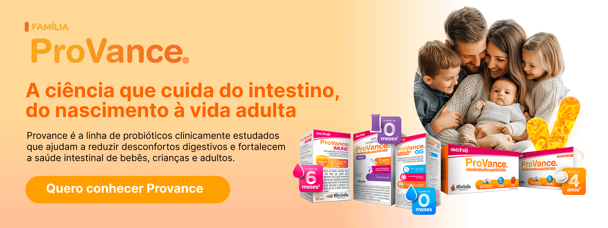 É por isso que a linha Provance oferece soluções específicas para cada idade, com probióticos de alta qualidade que chegam viáveis ao intestino e agem diretamente na microbiota.